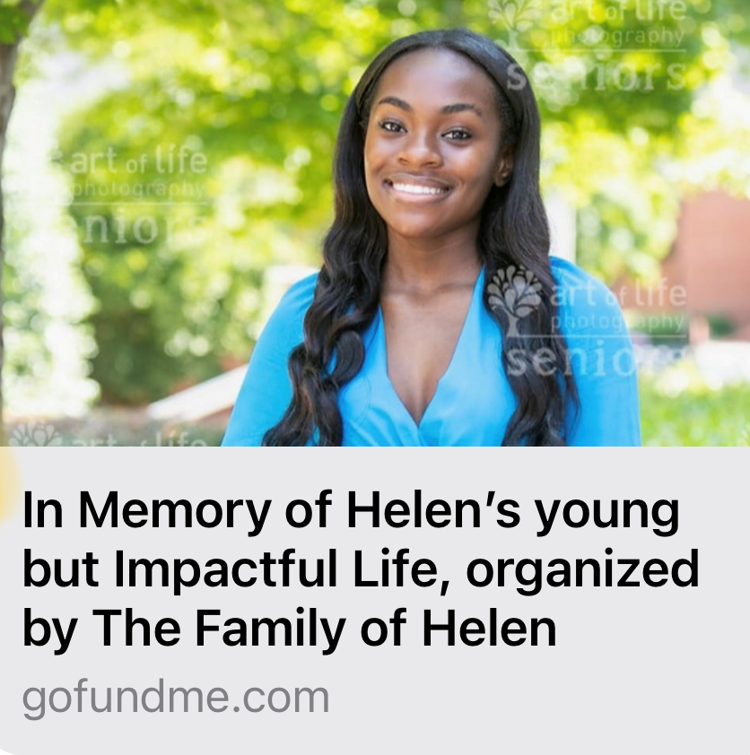 A Marist family (Helen’s school) has set up this gofundme page to help offset the funeral expenses and to honor/continue her legacy. Please consider a donation to this fund if you are so inclined. Click here to access the link.